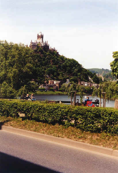 Anfahrt auf Cochem; im Hintergrund thront die Reichsburg über der Stadt. |