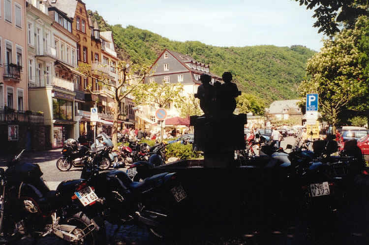 Der Cochemer Markt, direkt an der Mosel, ist ein beliebter Treff für Motorradfahrer aus aller Welt. |